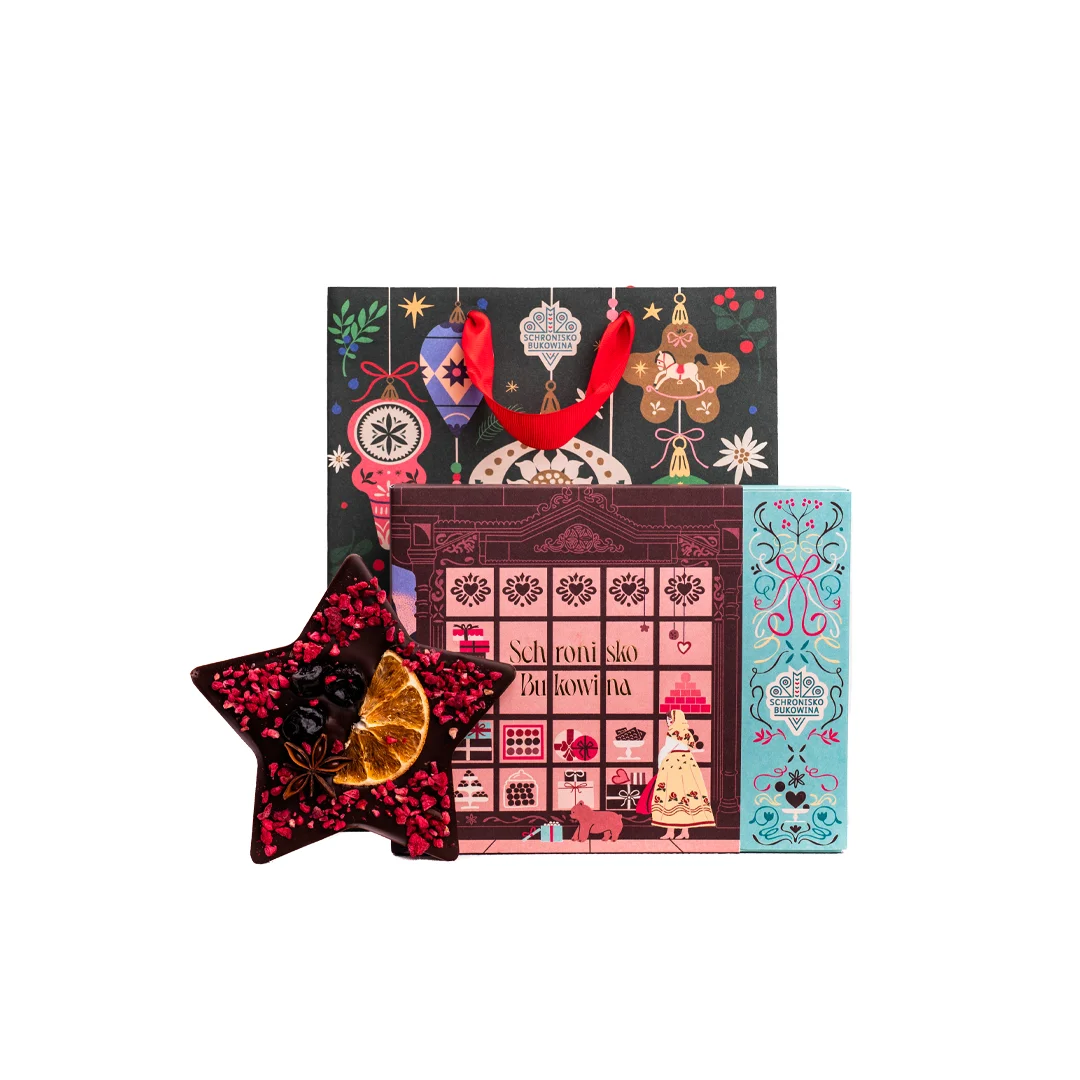 - 1 x Czekolada deserowa gwiazdka z pomarańczą, anyżem, liofilizowanymi wiśniami i malinami 100 g