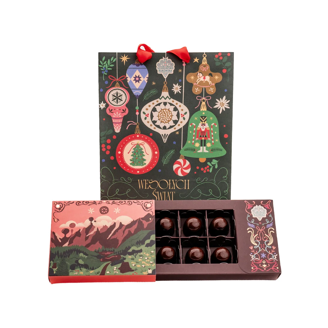 Poczuj magię świątecznego smaku w najbardziej eleganckiej formie. Nasze ręcznie robione praliny piernikowe to wyjątkowe połączenie aksamitnej belgijskiej czekolady deserowej z aromatycznym nadzieniem o nutach korzennych, cynamonu i miodu. Każda pralina tworzona jest z pasją w manufakturze czekolady Schroniska Bukowina, w małych partiach, przez mistrzów rzemiosła cukierniczego - dzięki czemu każda sztuka jest małym dziełem sztuki.